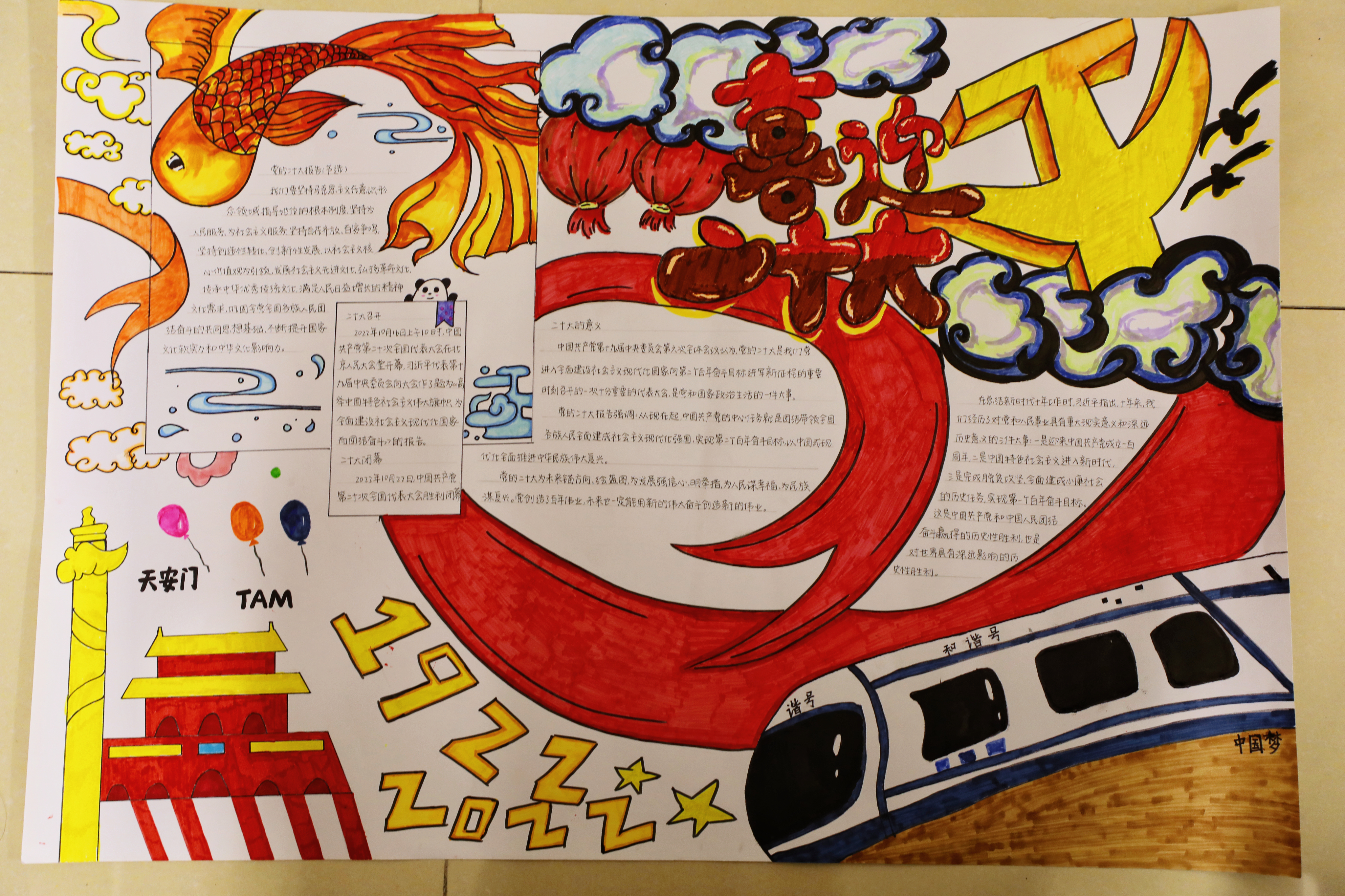 在此次学习二十大的活动中,全体党员师生以学习心得的形式向公司党委进行了学习汇报。不仅如此,同学们还充分发挥自己的想象能力与动手能力,绘制出了各式各样的精美手抄报,并用火箭、锦鲤、江水等比拟新中国的发展和命运,借此表达了他们对祖国的祝福与热爱。