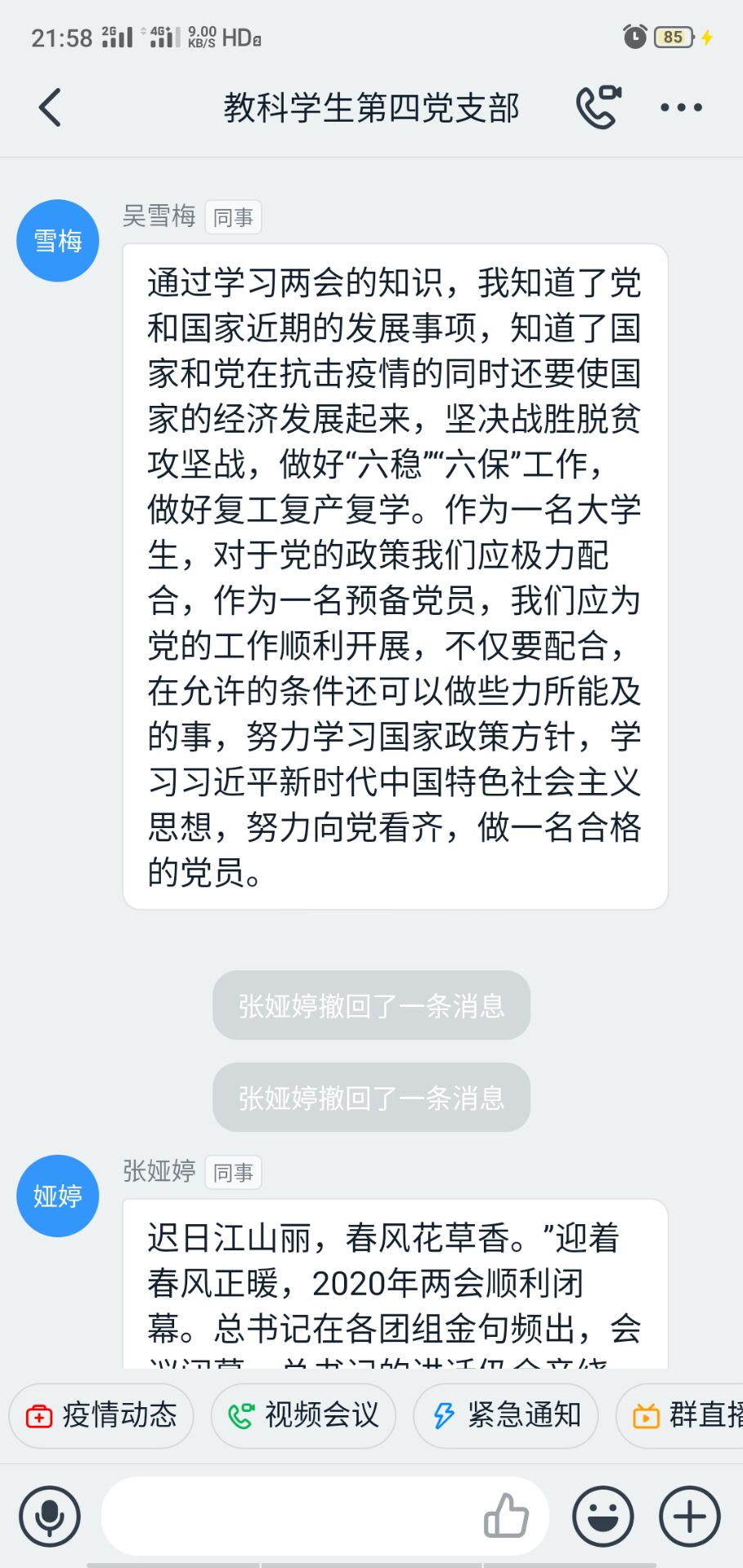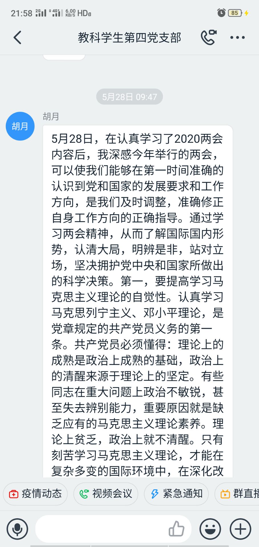 每一位与会成员根据自身经历与感悟积极发言,表达感想,交流学习心得。如:胡月同志分享道:5月28日,在认真学习了2020两会内容后,我深感今年举行的两会,可以使我们能够在第一时间准确地认识到党和国家的发展要求和工作方向,是我们及时调整、准确修正自身工作方向的正确指导。通过学习两会精神,从而了解国际国内形势,认清大局,明辨是非,站对立场,坚决拥护党中央和国家所做出的科学决策。吴苏杭同志分享到:学习两会的内容让我深刻体会到党和国家始终把群众利益,把人民生命安全和身体健康放在第一位。舒梦同志分享到:通过对两会文件的学习看到国家在促进我们老员工就业方面采取了很多措施,因此我们也要履行党员义务,积极配合国家的行动,顺利的完成全面建设小康的目标。