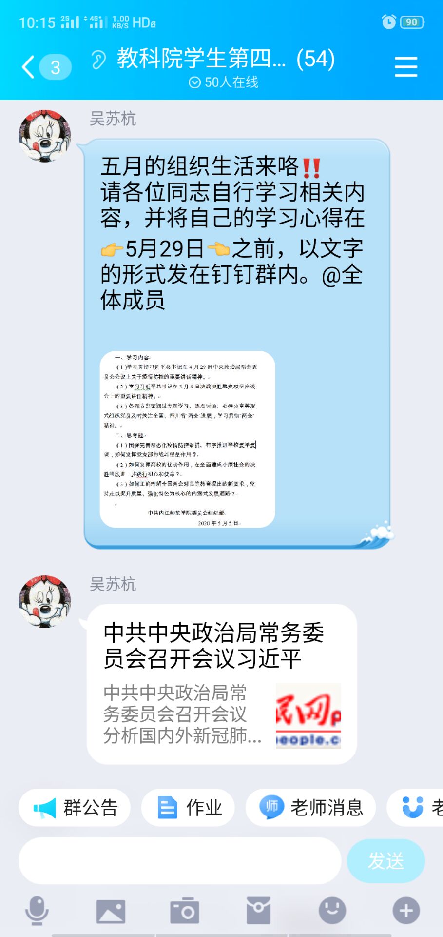 2020年5月29日下午,公司员工第四党支部开展学习:学习贯彻习近平总书记在4月29日中央政治局常务委员会会议上关于疫情防控的重要讲话精神;学习习近平总书记在3月6日决战决胜脱贫攻坚座谈会上的重要讲话精神;关注全国四川省两会进展,学习贯彻两会精神。受疫情影响本次学习依然通过线上学习。吴苏杭同志提前将学习内容、要求发到群里,同志们学习完后将自己的学习心得发在钉钉群内,并开展热点讨论。