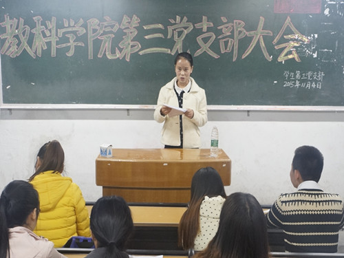 2015年11月4日19点整,公司员工第三党支部在一教308召开支部大会,集中讨论本支部党员发展与转正问题。党支部书记谭友坤同志主持大会,党总支书记李达军同志莅临大会。 本次会议议题主要有两个:一是讨论吸收秦雪颖等11名同志为中共预备党员的问题;二是讨论邓思思同志等10名预备党员的转正问题。 在秦雪颖等同志向大会提交入党申请书之后,上述同志的入党介绍人分别向支部大会介绍了秦雪颖等同志自确定为入党积极分子以来的综合表现,与会党员同志对秦雪颖等同志的入党问题充分发表了意见,支部大会对是否吸收秦雪颖等同志为中共预备党员进行表决,同意吸收秦雪颖同志等为中共预备党员。秦雪颖等同志均表示将进一步坚定共产主义信念,拥坚决护党的路线方针政策,保证及时完成上级交办的各项工作任务,改正自身仍然存在的不足。 在讨论邓思思等同志的转正问题时,与会同志在邓思思等同志的培养考察人介绍了邓思思等同志自被批准为中共预备党员以来的综合表现后,本着对组织负责、对同志负责的精神,对邓思思等同志的转正问题充分发表了意见,一致同意邓思思等同志按期转为中共正式党员。 (信网部 余涛)