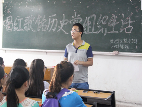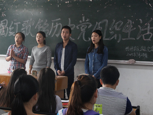 为了纪念抗日战争暨世界反法西斯战争胜利七十周年,2015年9月25日12点30分,公司党组织生活“唱红歌,铭历史”在一教303教室顺利召开。公司学工办辅导员姚鑫老师出席了本次活动,公司员工党员参与了本次大会,本次大会由团总支副书记曾娅主持。 本次活动以唱红歌的形式展开。第一党支部带来的《游击队之歌》让党员同志们重温了抗战岁月,感受到了党和人民的智慧与英勇;一首由第二党支部带来的《我的中国心》激发了党员同志对祖国的热爱之情;由第三党支部带来的《弹起我心爱的土琵琶》认真歌唱,声情并茂,全场沉浸于红歌的氛围中。活动最后,每位党员手持一本《中国共产党员手册》,学工办辅导员姚鑫老师强调:希望党员同志认真学习手册,做一名合格的共产党员。 活动的时光总是短暂的,但我们相信活动的意义是永久的。通过本次活动,不仅增进了同志们之间的友情,促进了党员同志对党发展历史的学习,更激发了员工党员的爱国之情。 (信网部 王露)