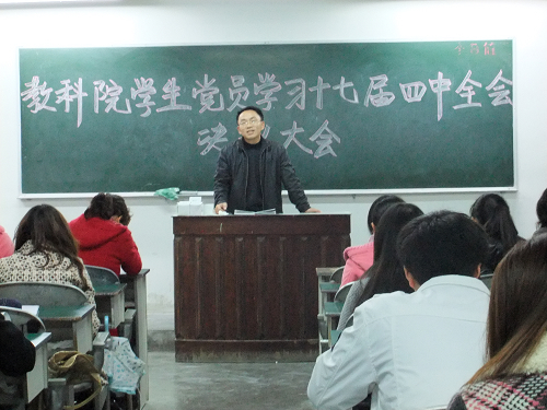 他首先介绍了党的十七届四中全会召开的背景,分析了四中全会通过的“关于加强和改进新形势下党的建设若干重大问题的决定”的主要内容及其重大意义。