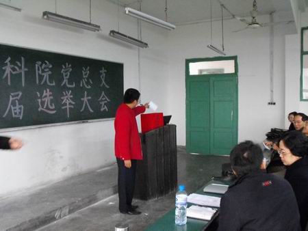 在刘毅副经理讲话完毕后,王孝红同志宣读了《教科公司党总支换届选举办法》。在征求了参会党员意见,并经民主表决通过后,兰书记宣布此《办法》正式生效。接着,他介绍了6位候选人情况,通过了监票人、计票人名单。在经过计票人吴志晓老师清点党员人数发出选票后,监票人杨雪特老师讲解了选票填写注意事项。随后,正式党员进行了投票。经按程序唱票、计票后,产生了公司新一届党总支委员委员,他们分别是:王孝红、兰永海、陈理宣、谭友坤、慕彦瑾。大会在雄壮的国际歌声中顺利结束。