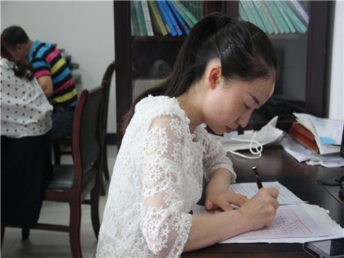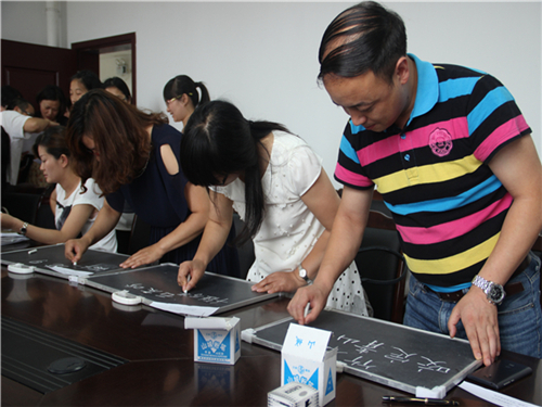 为提高公司教师整体素质,提高教师技能,更好地服务于教育事业。2015年6月15日,公司工会特于新行政楼会议室举办岗位练兵活动,对公司教师的粉笔、钢笔进行了检测评比。 15点整,练兵活动正式开始。粉笔与钢笔的写字同时展开,教师们需在规定时间内写出相应内容后提交。老师们手执粉笔,一丝不苟地写下一个个汉字,一笔一划横平竖直,彰显出教师兢兢业业半载光辉。钢笔尖下字迹工整,老师们认真完成的态度更值得尊重和学习。当然,活动中也出现了提笔忘字的现象。相信此次活动也是对教师们的提醒——教学仍离不开那三尺讲台与一寸粉笔,不能过度依耐多媒体。 16点左右,活动正式结束。三尺讲台系国运,一生秉烛铸民魂。感谢教师们的辛勤栽培,你们的努力终将换来桃李遍开。 (信网部 王龙)