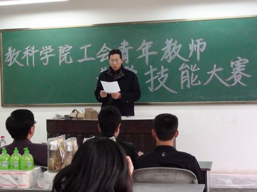 为结合公司与公司正在开展的“创先争优”、“三育人”活动,进一步加强青年教师教学技能培训工作、提高教师素质,公司教师工会于2011年11月21日14点40分在三教203开展了青年教师技能比赛。比赛分为钢笔字比赛和粉笔字比赛两个板块。此次比赛由公司副经理、工会主席杜高明主持,担任此次比赛的评委有公司副经理、工会主席杜高明,小学教育教研室主任胡志金教授,曾令英副教授,第八届员工团总支宣传部部长强飞,2010级1班雷朝林同学。