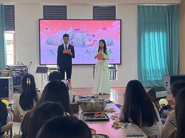 在节目展演环节,郭嫒冰等同学带来群舞《一起向未来》,她们以青春的无限活力,表达对生命的热爱;张萌瑶同学为大家带来的古筝独奏《青花瓷》,演绎中国古韵。彭新月、周冰华合唱的《爱你》,甜美的歌声唱响当日气氛。在手作粽子的环节中,同学们在欢声笑语中进行包粽子的初次尝试,以民俗活动传递端午节蕴含的文化内涵。其后是粽子品尝环节,同学们在品尝粽子的同时观看了班级精心剪辑的视频片段,视频中包含了73名同学的生活片段,全班同学的笑脸映入眼帘。