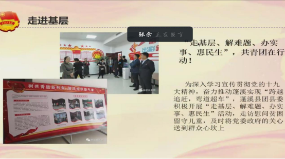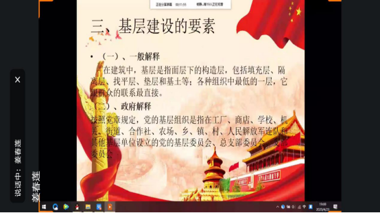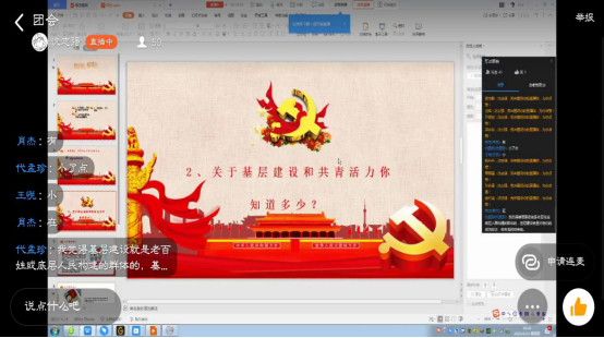 在4月23日后,各班都以丰富的形式开展了线上主题团日活动。其中17级3班同学紧扣主题,通过介绍“基层建设的基本内容、基层建设中我们能做什么、怎样参与基层建设”,让同学们更加深入了解基层建设;18级2班同学以每个人发表自己的看法和感想,把基层建设与实际行动相结合,更好地调动了青年团员的活力;19级1班则介绍了青年大学习,告诉我们作为共青团青年应当有理想,有本领,有担当,来促使同学们认真对待每一期的青年大学习;19级2班则请徐妙同学分享了在疫情期间志愿工作中的感受与体会,她说:“作为一名光荣的共青团员,我只是贡献了自己微薄的力量,但是‘星星之火,可以燎原’,我们应当万众一心,为基层建设奉献新的共青活力”。她的所言所行向大家展示了共青团员蓬勃的活力,也引起了其他同学的共鸣。
