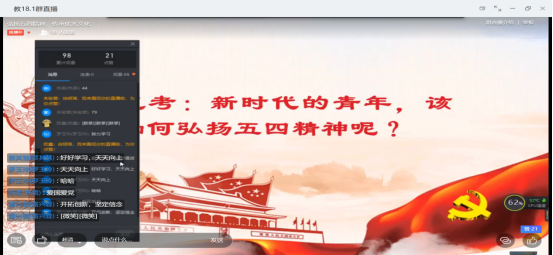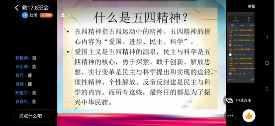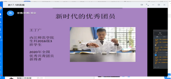 截至5月23日,各班在线上开展了丰富多彩的主题团组织生活。其中17级8班的同学紧扣主题,主持人向同学们详细地介绍了五四运动与五四精神,同学们在深入了解中表达对“五四”精神的感悟和传承;17级1班介绍了公司2020年全国优秀共青团员获得者——生科2016级3班员工王丁广同学的先进个人事迹,以此鼓励同学们向优秀团员学习,在社会中发挥自己力所能及的力量;18级1班通过问题“作为新时代的青年,我们该如何弘扬五四精神?”,让每个人发表自己的看法和感想,将弘扬五四精神与实际行动相结合,更好地调动了青年团员的活力;19级2班组织大家一起观看了微视频,在视频中,同学们看到各行各业的青年人都尽心尽力做好工作,时刻为祖国奉献出自己的身躯,从而感受到五四精神的强大力量,青年一辈的坚定信念,引起了强烈的共鸣。