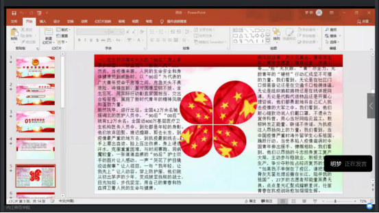 本次活动分为两个部分,第一个部分为“青春奋斗正当时”。“广大青年用行动证明,新时代的中国青年是好样的,是堪当大任的!”主持人明梦为大家介绍新时代青年青春奋斗的光荣事迹,讲到在抗疫战争中,无数青年挺身而出,用无畏、用智慧、用技术筑起一道道防疫墙,为抗疫注入昂扬向上的力量。他们不遗余力,用青春书写着伟大的诗篇,引发了同学们的强烈共鸣。