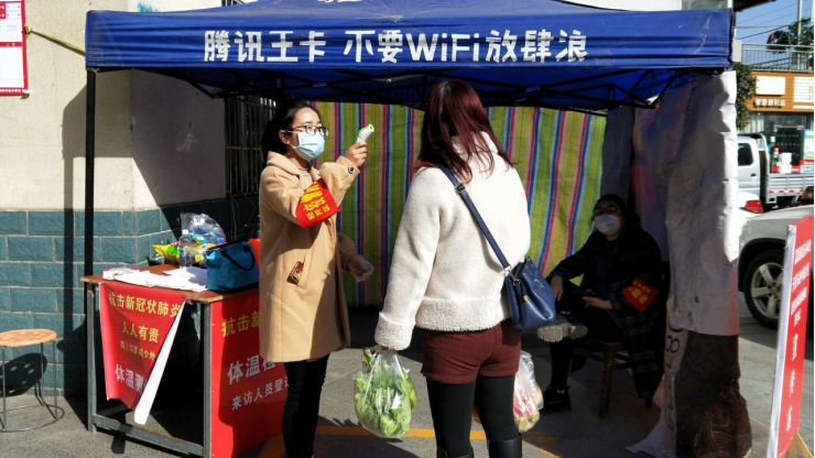 (张慧灵正在检测来访人员体温)