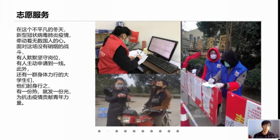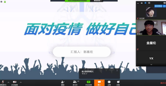 班会主要通过5位同学的分享展开。马佳鑫同学谈到自己家乡的防疫措施,并给大家分享了全国各方为武汉运输物资的相关视频。从疫情爆发以来,无数的志愿者投入到“战疫”的队伍当中。杨惜同学向大家分享了自己在当志愿者的情况,如给人们量体温、打印健康证等;在这个时候,不论是做出多小的奉献,所折射出的都是深深的爱国情怀。金星伦和郭嘉欣同学谈到,虽然网上教学有诸多的不便,但全体师生依然在全力配合,并做好学习规划。在这个关键时期,作为员工的我们也充分做好了“疫情不结束、网课不停学”的准备。此外,他们还强调正是在这个时候,大家对于网上的信息更应该正确看待,不信谣、不传谣,并为在疫情一线的医护工作人员点赞。