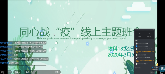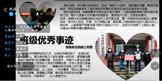 本次班会中各班根据实际选择运用易班、钉钉、微信、雨课堂、腾讯会议、腾讯课堂等网络平台,以线上形式开展。教育引导员工认识到疫情防控是当前最重要的工作,自觉服从和支持公司疫情防控的各项工作安排,众志成城,共克时艰。学习分享抗击疫情阻击战中的优秀事迹和感人故事,充分激发员工的责任使命感,大力弘扬新时代爱国主义精神。加强对健康理念和传染病防控知识的宣传教育,着力提升科学素养。明确疫情防控期间网课学习纪律、考勤纪律等各项网络授课要求,进行线上上课、自主学习的具体指导。