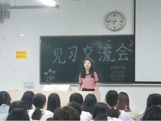 一位在内江见习的同学分享提到:老师在课堂上要有威严,在课下要有亲和力;一位在成都见习的同学们谈到了小学教材的变化,“三型”教育模式的创新;一位在重庆见习的同学介绍了小学的分班教育,例如:特长班、精英班;还有一位在广汉见习的同学提到了自己见习公司的氛围和作为一名教师应有的心理素质和综合能力。