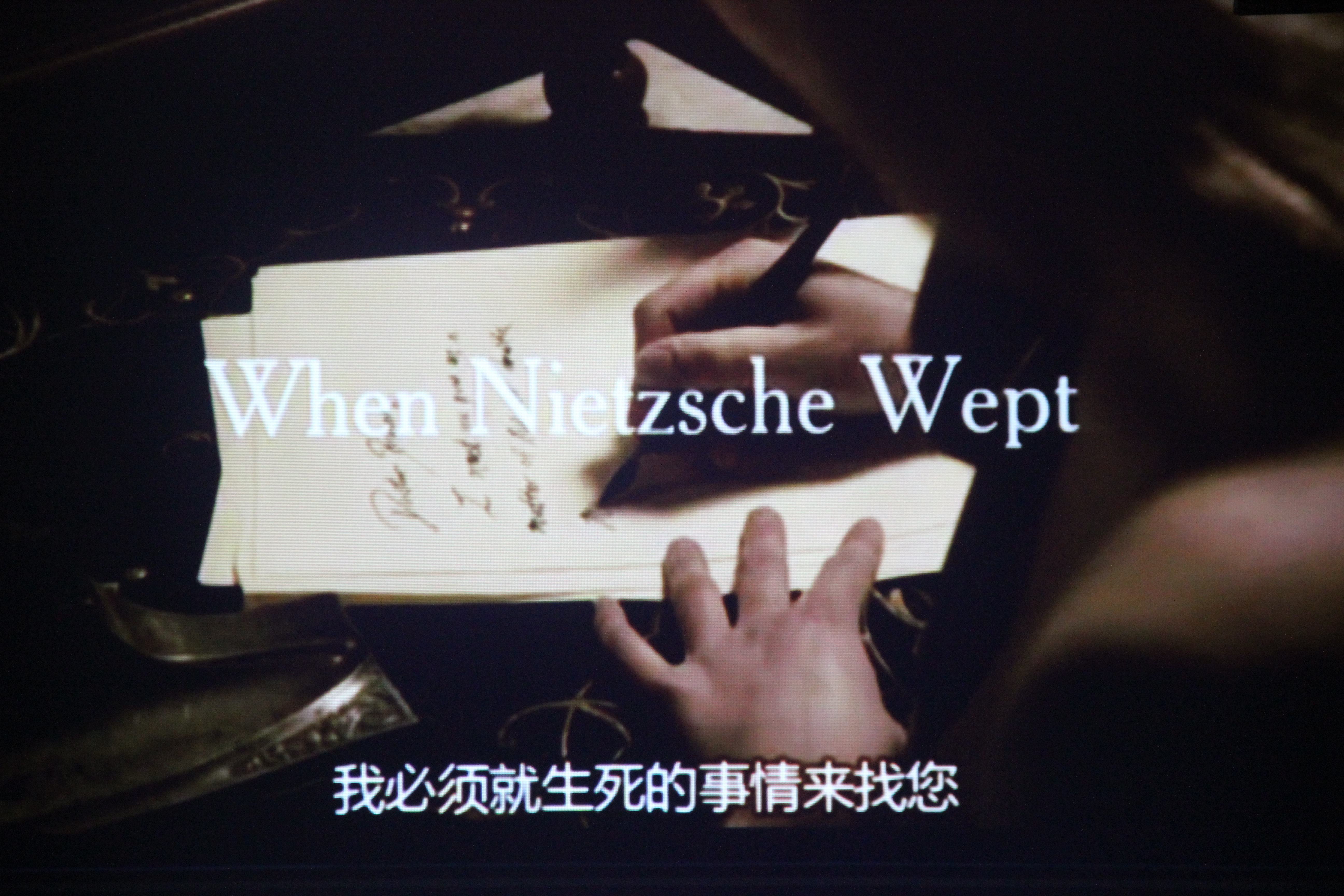 电影开播前,主持人韩莉对电影的相关内容进行了介绍,简单介绍了主人的身份背景。《当尼采哭泣》这部影片是由其同名心理治疗小说改编而来,讲述了著名哲学家尼采和布雷尔医生之间心灵上相互碰撞的动人故事。影片中的尼采具有自杀倾向,布雷尔医生运用实验性的“谈话治疗”诊治尼采,协助他解决生命意义的难题。在一个月的相互心灵冲击下,尼采如诗般的语言和理性的思辨让布雷尔诚实地面对自己的人生,尼采也终于释放了孤傲的灵魂,流下了真实的眼泪。影片中表达了哲学家大多是孤傲的,但是他们也常常因为孤傲而被生活毁灭。