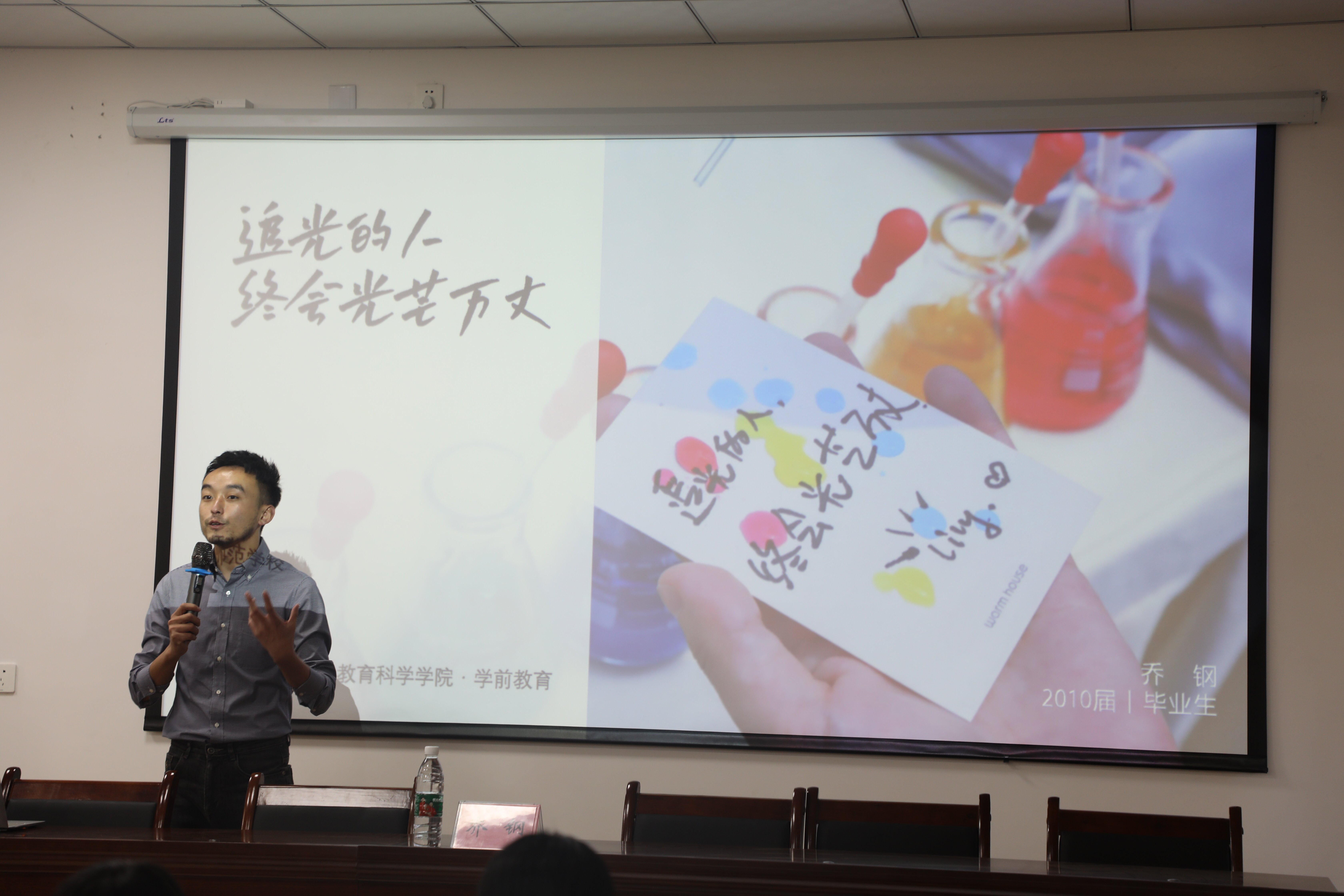 乔钢首先分享了自己的老员工活经历,他参加各项活动,利用闲暇时间走进幼儿园,走进儿童,在这过程中受益匪浅。因此,他鼓励同学们也应积极投身到课外活动中去,积累实践经验,为今后的学习、就业打下坚实基础。随后,乔钢以自身工作为例,为学弟学妹们分享了带班和管理经验。最后,他强调一名优秀的教师要有丰厚的学识,同时也要用爱心呵护小朋友,并坚持以学前教育为终生事业。
