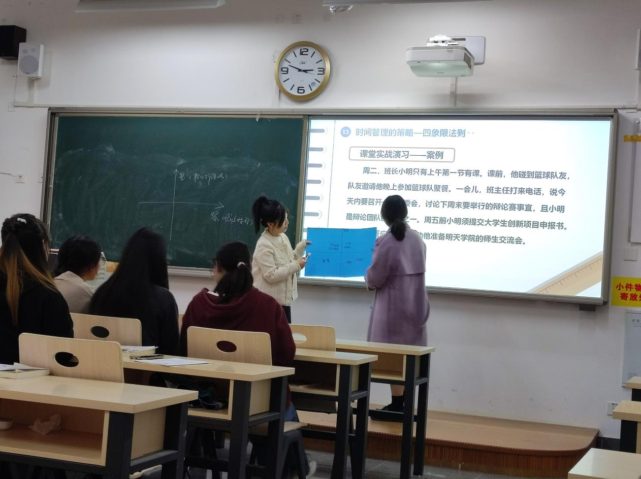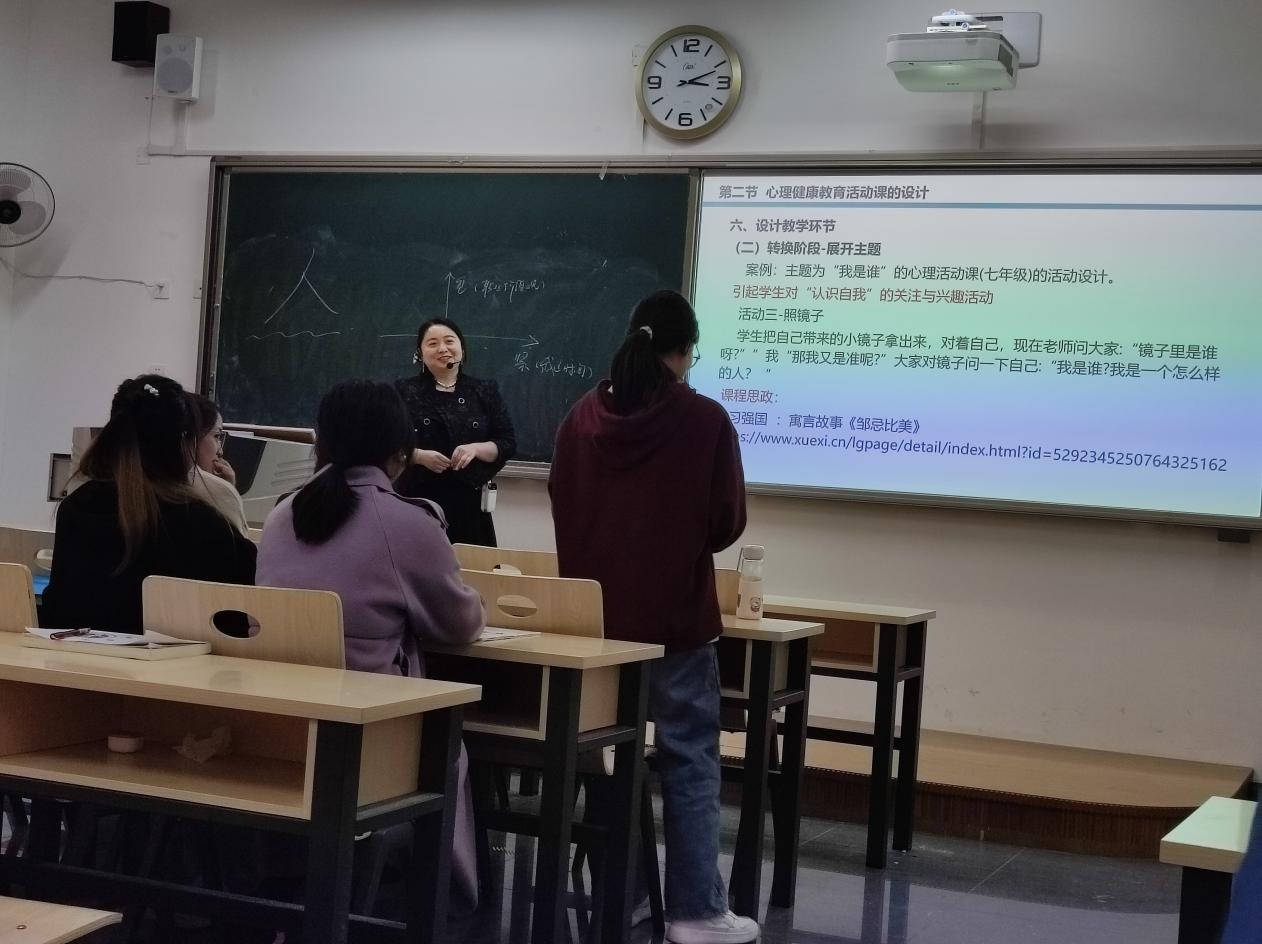 本次公开课老师紧密结合时政,将思政教育元素融入课堂教学全过程。季晓华教授的题目选自《小学班队工作原理与实践》课程中的《班队干部选拔与培养》。她先展示了小学班干部腐败的N种形式,接着揭示了民主选举的困境,最后从育人角度阐述了如何有效运行民主选举。邓昌杰老师的题目选自《中小学心理辅导》课程中的《心理健康活动课的设计》。她先从设计课程目标、思政设计思路、思政典型案例设计、思政实施程评价与成效、特色与创新这五方面进行了阐述。然后从暖身、转换、工作、结束四环节,并结合思政案例明确如何设计心理健康活动课。其中,通过“寻找有缘人”、“我是谁”等游戏融入思政元素。钱愿秋的授课内容是《老员工心理健康教育》中的《时间管理》一课,授课环节为时间管理的内涵和本质、管理的必要性、策略等几个环节,每个环节都融入思政元素。