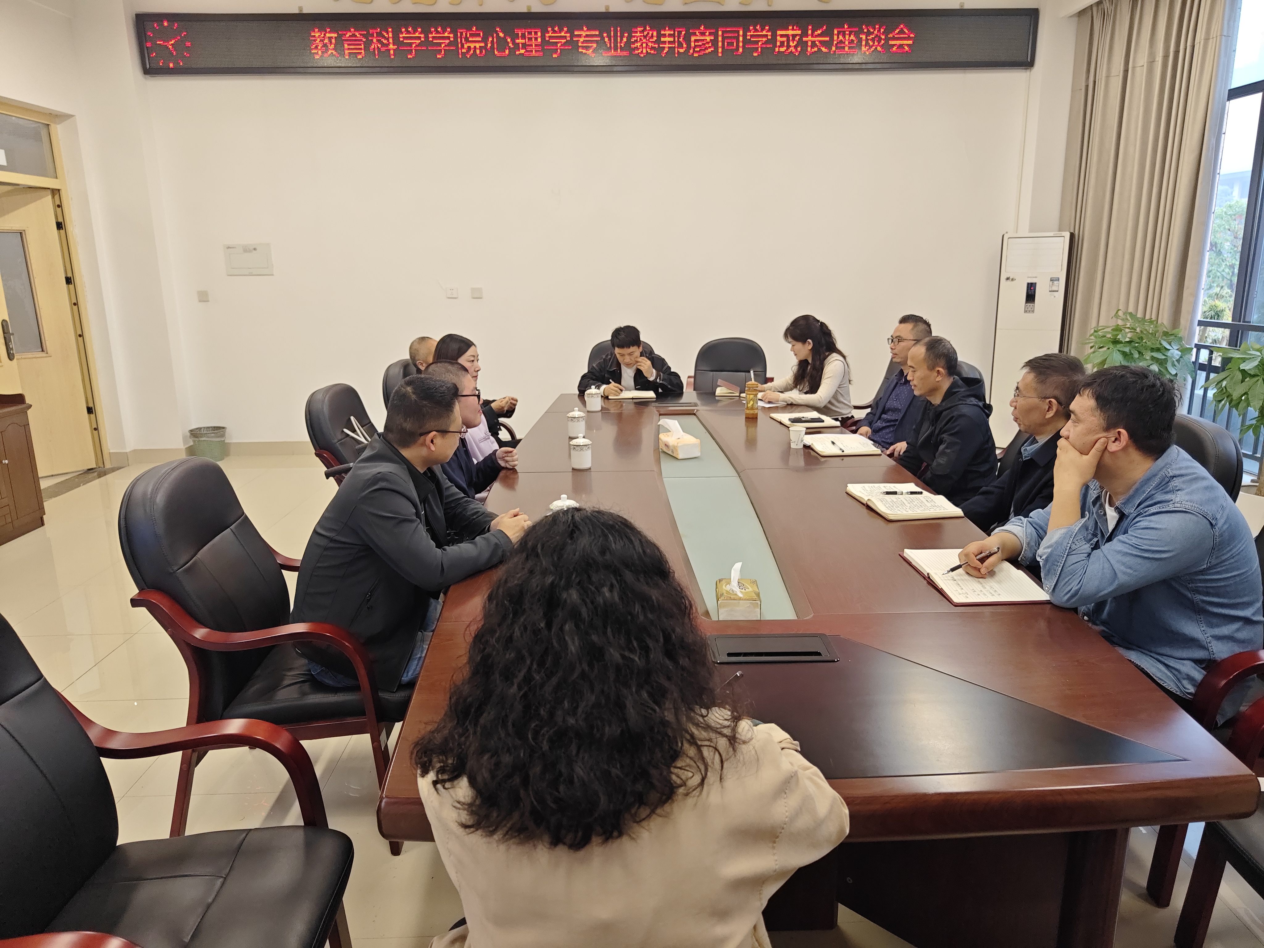 20231026日上午9点,tyc5997太阳集团组织开展了“黎邦彦同学成长座谈会”,诚邀黎邦彦同学及其家长和公司员工员工工作部部长商林威,公司党委书记兰华,经理胡志金,党委副书记谭友坤,学工办主任杨林,班主任肖田,专业教师鞠晓蕾博士共同参与本次成长座谈会。