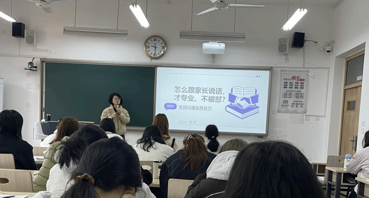 2026年3月9日上午10点,学前教育专业开展了一场主题鲜明、实用性极强的讲座。本次讲座面向24.3班全体同学,由学前教育教研室郁容博士主讲,聚焦“怎么跟家长说话,才专业、不被怼?”这一核心议题,为同学们搭建了提升家校沟通能力的学习平台。