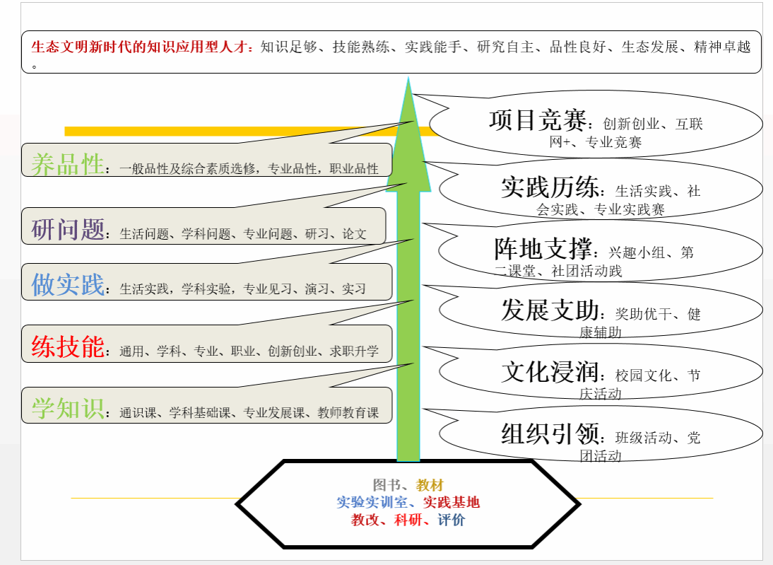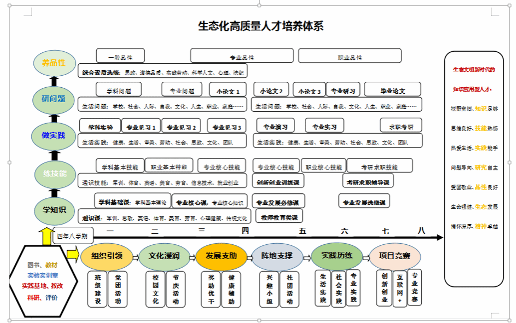 1.生态化高质量教师教育人才培养方案。具体包括:教育理念、人才目标、教学模式、文化环境、管理机制、质量文化、课程、教学工作、第二课堂、实践教学、员工工作、班级建设、成长平台、思政教育、劳育、美育、健康教育、校地协同等18个子系统。