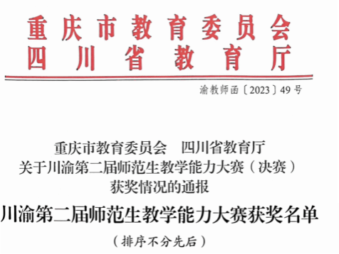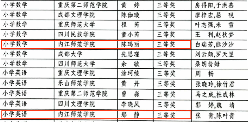 12月11日,重庆市教育委员会和四川省教育厅公布了川渝第二届师范生教学能力大赛获奖名单,公司小学教育专业2020级学子陈玛丽和那静分别荣获小学数学组和小学英语组三等奖,学前教育专业2020级学子苏怡荣获学前教育组三等奖。