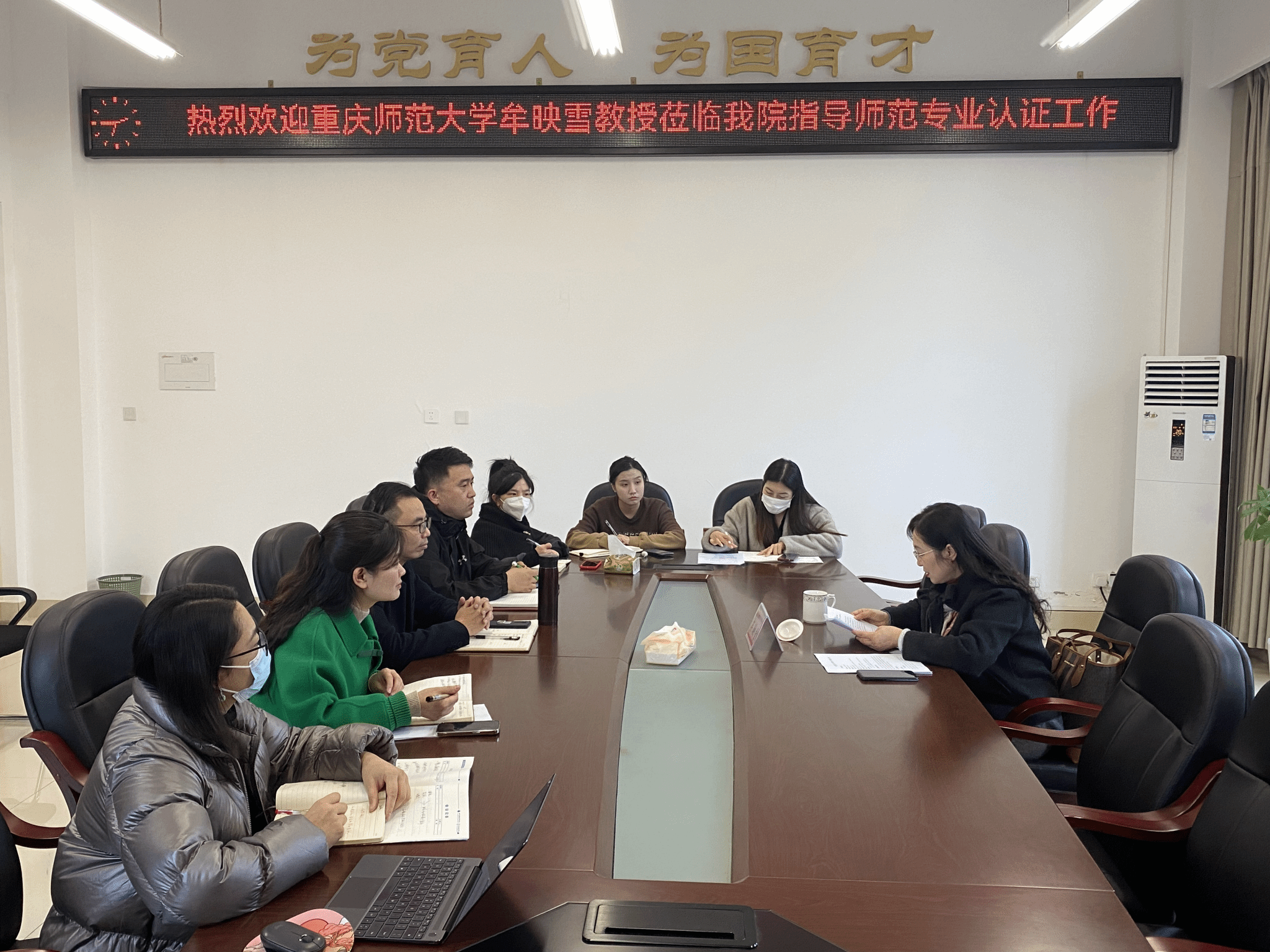 2023年123日下午14:00,公司邀请了重庆师范大学牟映雪教授在弘文楼205会议室指导学前教育专业的师范专业认证工作。本次会议由公司党委书记兰华主持,党委副书记兼学前教育专业负责人谭友坤、学前教育教研室主任钱愿秋以及学前教育教研室教师吕佳佳、杜婉绮、欧阳斐等人参加了此次交流