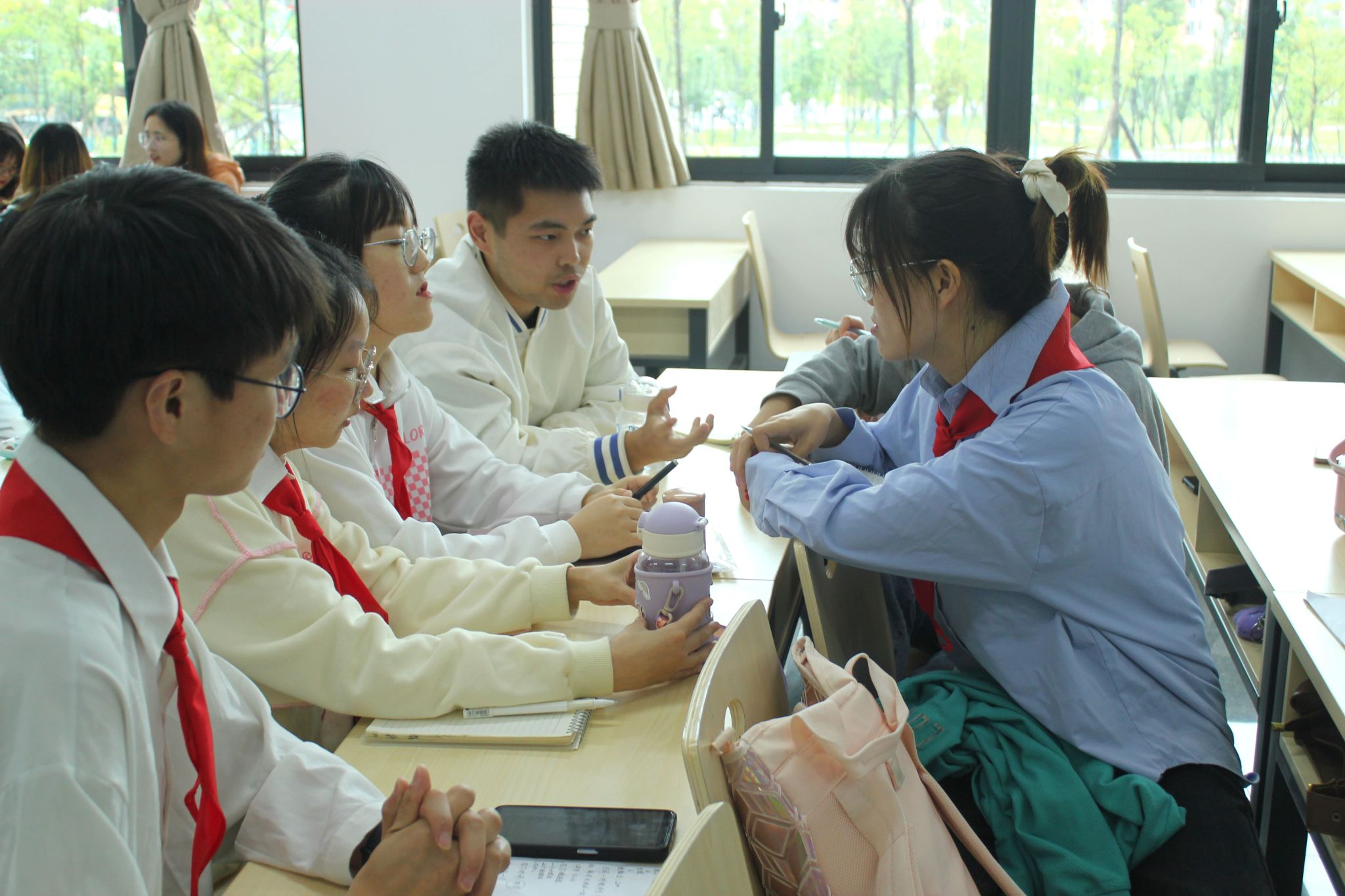 第二场东兴区实验小学教科室主任、语文教学专家朱艳老师指导课上,20.8B“小员工”扮演者,在交流、总结第一场数学专家蓝副董事长指导课中“小员工”的表现,增加了红领巾元素,力求使自己更真实接近工作对象,获得更多“学情分析”认识。