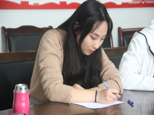 面试开始,党总支书记杨梅对参加此次竞聘的同学表示充分肯定并简单介绍了选聘外教助理的目的和要求。本次选聘分为面试和笔试两部分。面试环节,同学们大方自信,流利的英语给面试老师留下了深刻的印象。竞聘同学纷纷表示,愿意帮助外籍教师整理资料,做好授课准备以及辅导学员学习,积极配合老师开展教学工作。笔试环节,学员奋笔疾书,用十分钟的时间交上了一份满意的答卷。评委们从综合素质及个人能力等方面对应聘同学作出了客观评价。在此次选聘中,张余、彭丽丹、蒋玉婷三名同学脱颖而出。