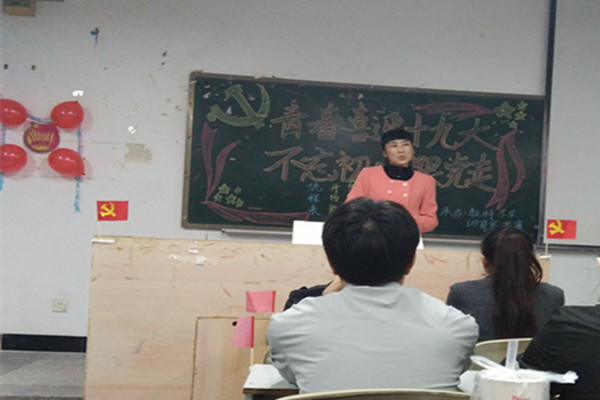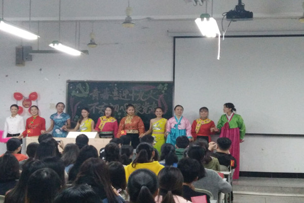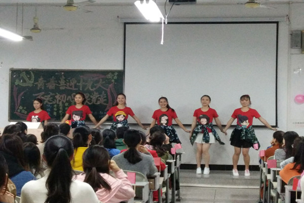 走进教室,黑板上庄严的党徽,讲台上鲜红的党旗,仿佛置身于一个神圣的红色殿堂。同学们到来后迅速落座,17点整,伴随着歌曲《咖喱咖喱》欢快的节奏,同学们以一场青春激扬的开场舞拉开本次班会的序幕。随后主持人宣布“2015级4班‘青春喜迎十九大,不忘初心跟党走’主题班会正式开始”。接下来一系列节目将现场气氛带入高潮,民间曲艺《双簧》通过劳动人民代代传承的故事,讲述了中华民族几千年的文化和智慧,民间艺术之所以能经久不衰,是因为它的内容和表演形式深得人心,如同中国共产党心系人民为人民服务,人民便拥护它、歌颂它;三首《红歌串烧》,颂唱了中国共产党带领祖国人民从贫穷走向繁荣富强的事迹;小品《治贪门诊》用诙谐又不伤大雅的表演形式将“以人民的名义惩治贪腐,坚持老虎苍蝇一起打”的理念,镌刻进每位观众的心里;96年漫漫长路,我们始终坚持中国共产党的领导,诗歌朗诵《永远跟党走》,诵出了我们不变的誓言;青春的号角铿锵作响,年轻的活力奔涌激荡,年轻一代身着特色民族服饰,一首《把青春献给党》描绘出一幅56个民族欢聚一堂,歌唱祖国日新月异,祝福祖国繁荣富强的画面。