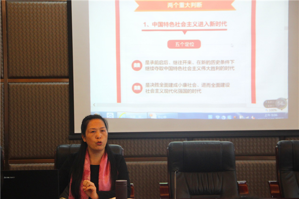 10月20日上午,公司党总支中心组(扩大)学习会在行政楼320会议室集中学习党的十九大报告精神。参加学习会的有公司全体总支委员、各党支部书记、总支办副主任、党员辅导员等。学习会由党总支书记杨梅同志主持,学习的主要内容分为两部分:一是在参学人员自学习总书记十九大开幕会报告原文的基础上,通过图表形式集体学习十九大报告主要精神;二是通过40个新提法新举措全方位解读十九大报告。