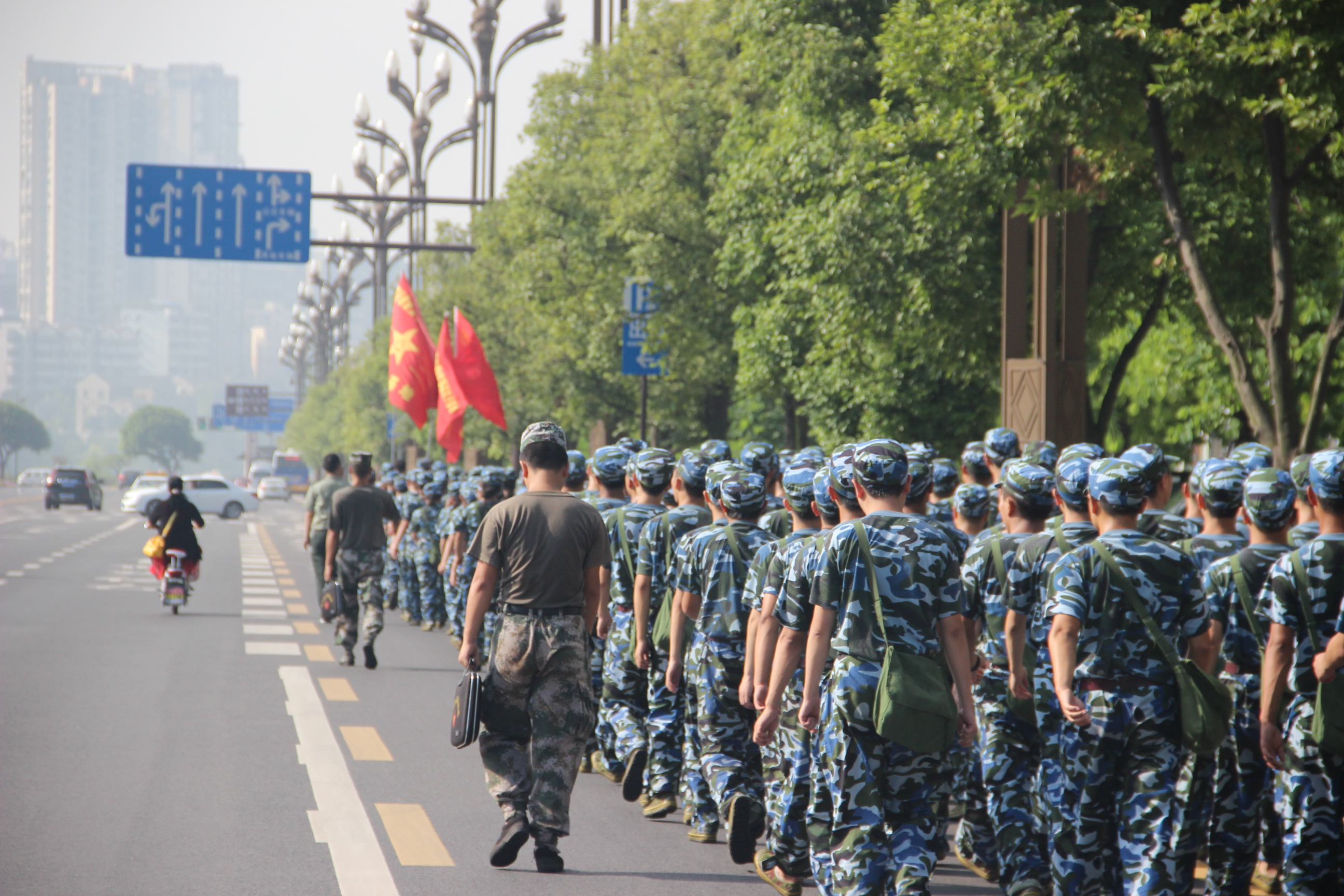 夏末初秋,天气凉爽,正是军训拉练的好天气。拉练途中,走在最前方的是三位气宇轩昂的护旗手,后方同学们四人为一排,保持整齐的队形。刚出公司,便有连队自发唱起军歌,嘹亮的歌声让拉练变得有趣,整齐的迷彩队伍引得沿途的路人频频驻足观看。路程过大半时,气温也逐步升高,有的同学体力渐渐下降,步子变得缓慢,但她们依旧坚持着、彼此鼓励,没有停下脚步。到达公司时已是9时50分,同学们前往田径场集合;在休息、调整之际,绿茵场上又响起了嘹亮的军歌。
