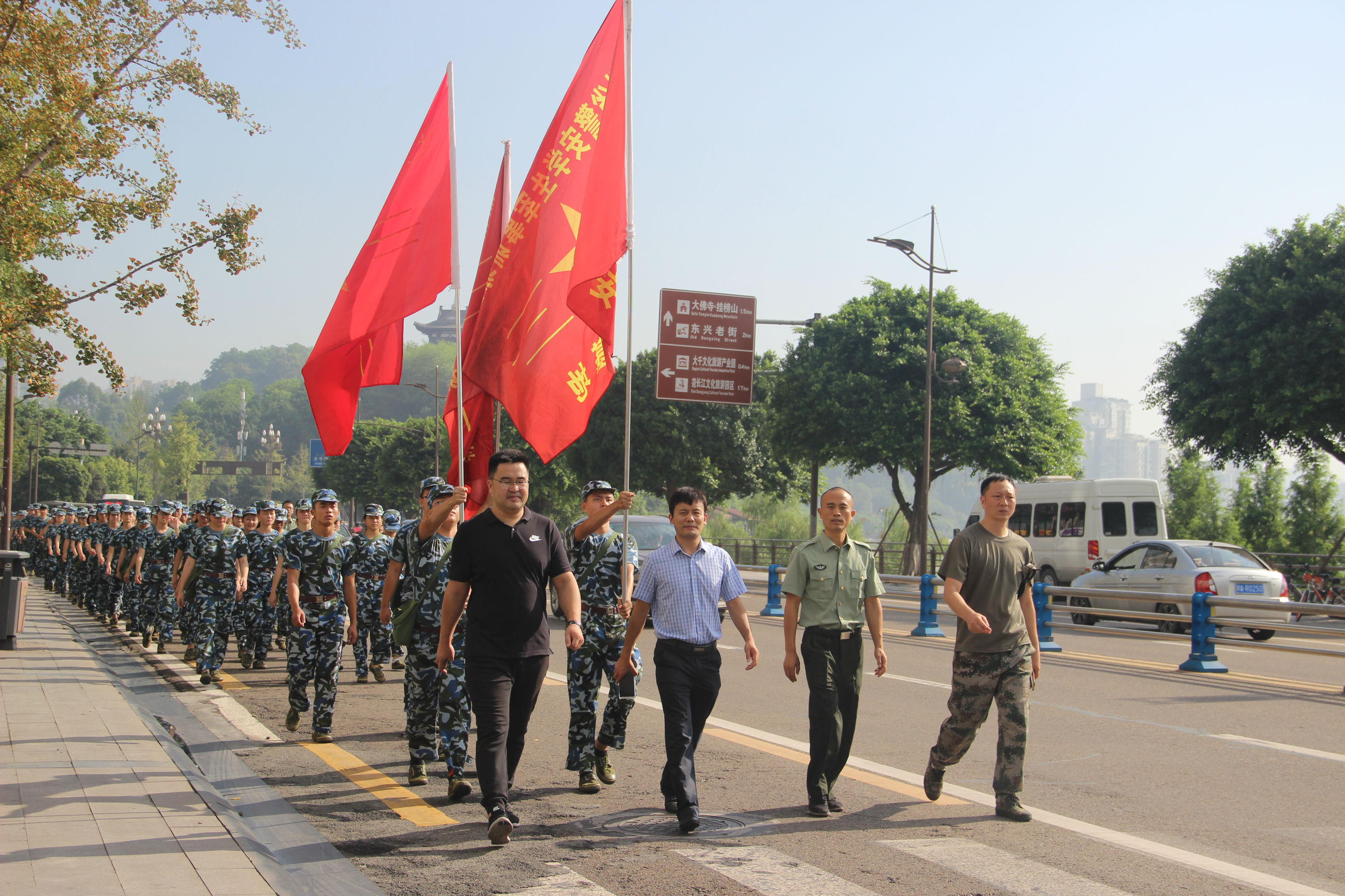 2017年9月7日早8时30分,随着一声声响亮的哨声,公司员工身着迷彩、肩负背包、踏着整齐的步伐由田径场出发,参加他们军训重要的一项任务——徒步拉练。公司党总支副书记邓川,学工办老师姚鑫、苟远萍、杨倩、杨林参加了本次军训拉练。