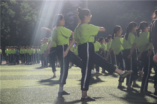 9月11日,训练的难度逐渐提升,躲过了白天太阳的炙烤,晚上仍要拖着疲累的身躯继续训练,灯光下的他们格外美丽。只见绿茵场上,着装整齐,口号响亮,步伐有力。大家坚持着一遍又一遍地练习,从中享受这痛并快乐的军训时光。