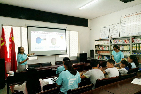 8点30分,志愿者们早早的到达社区并与社区负责人进行沟通,确认好今天的活动安排。并打开多媒体进行展示,将小朋友安置在各自的位置上,等待课堂的正式开始。首先是同学们自己做家庭作业,志愿者在一旁为其辅导,队长负责课堂纪律。一个小时过后,结束了课业辅导,进行手工制作的教学。志愿者们利用准备好的PPT,拿出将要使用的材料合理分发给各位同学,为同学们进行讲解,大家一起完成手工制作。