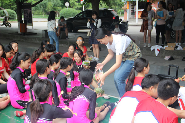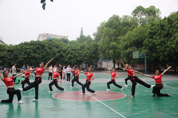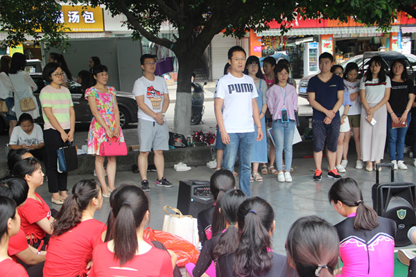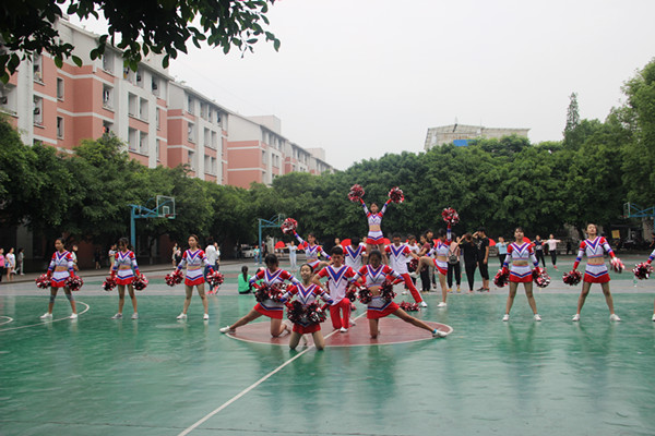 2017年5月18日9点40分,公司党总支副书记邓川与学工办老师苟远萍、姚鑫、杨倩,以及公司团总支员工会代表前往东区篮球场慰问健美操大赛参与队员。