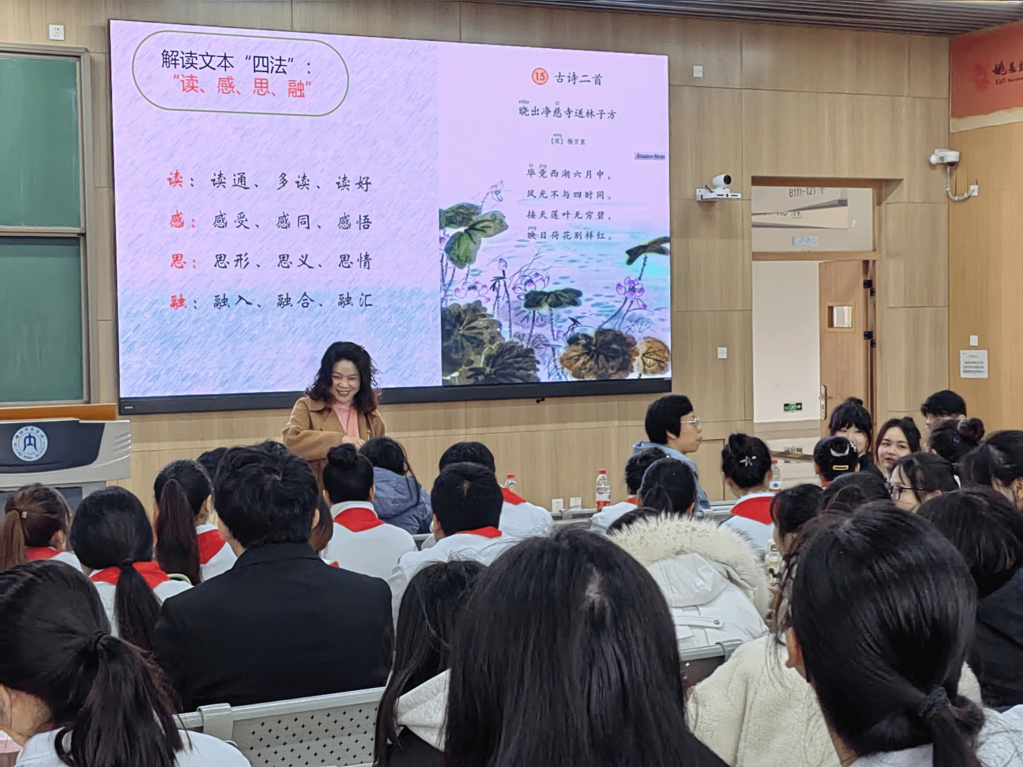 第一场邀请成都市青羊实验中学附属小学科研室郭宗艳主任进行《小学语文教学设计的几个常见问题》指导讲座。郭老师从制定教学目标、解读文本、设计教案、课堂教学的几个误区四方面,将在课程标准指导下“理论中的教学设计”与“实际教学操作中的教学设计”比对,强调实际操作中的教学设计必依据小员工具体学情,做出合理调适。