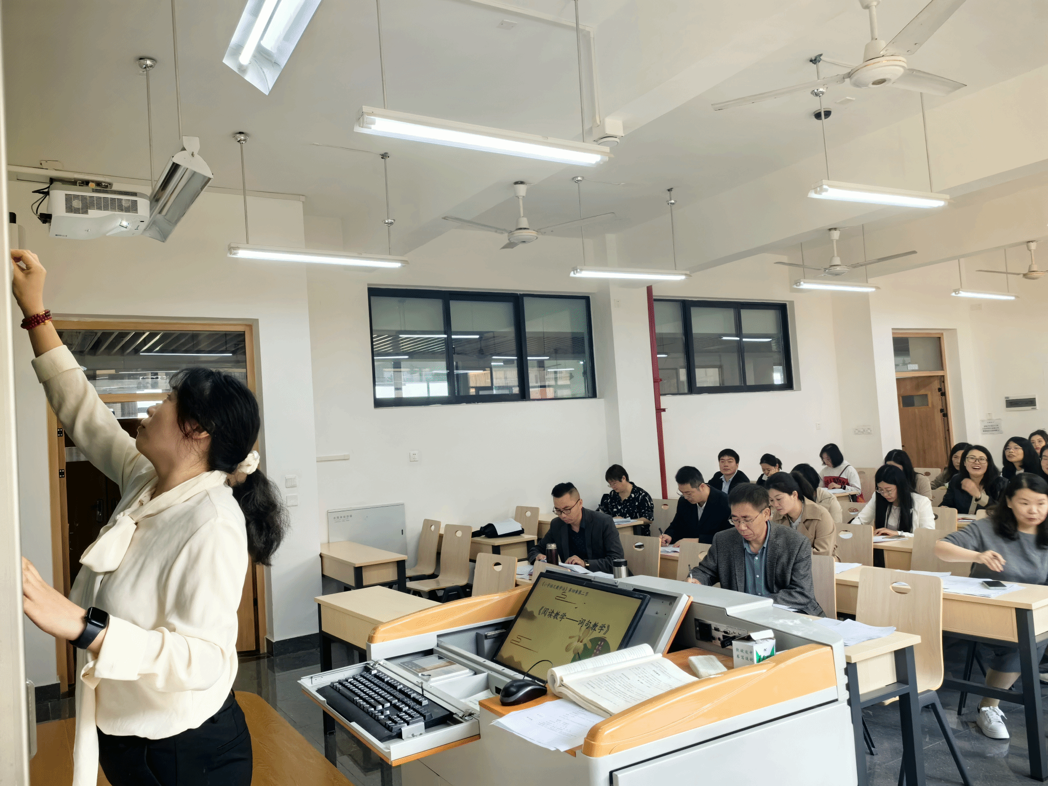 本次参加教师公开课共有7名教师,分别以自己本学期任课课程,按5分钟说课和10分钟讲课进行公开课展示。其中小学教育教研室董晓红老师的《小学语文教学法》课程,坚持以员工为中心,以未来小学语文教师岗位能力为导向进行教学设计,通过对阅读教学的内涵、目标、内容和方法的介绍,辅之以一线教学案例,任务驱动,让员工在做中学,提升了专业员工的实操能力;应用心理学教研室鞠晓蕾的《咨询心理学—小员工常见的心理问题》课程中重点分析了小员工心理行为问题的概述、常见的小员工心理适应问题和攻击性行为的原因及特点这三个方面的内容。白瑞芳、倪佳宾、黄惠子、杜婉绮、彭玉发老师也分别在自己的授课过程中从丰厚的理论知识、端庄的教学仪态、课堂管理的把控、师生互动等方面展现了自己的特色。
