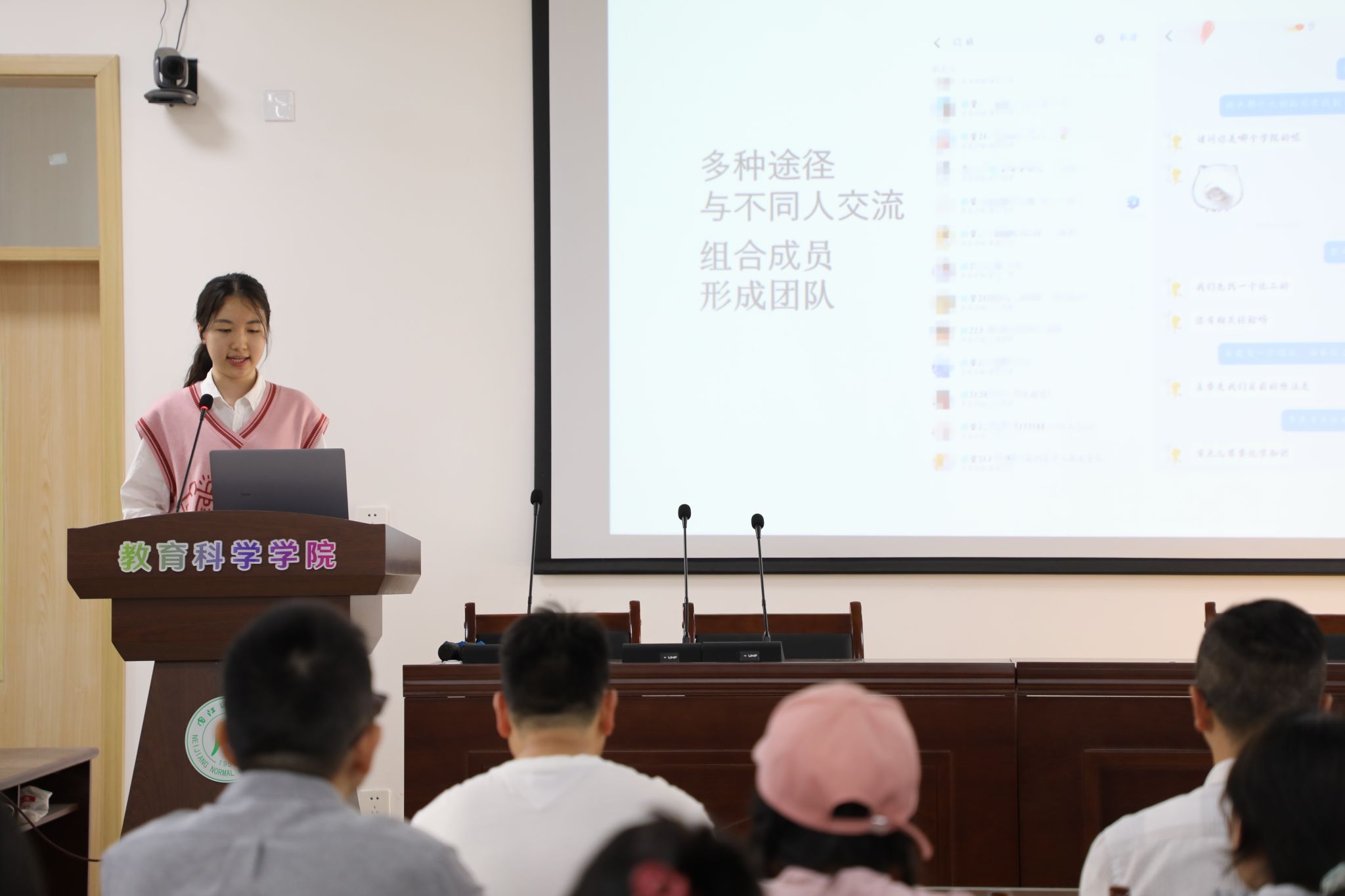 随后,创新创业代表21级3班左一岑同学发言,她通过分享自己的创新创业经历,呼吁大家积极尝试自己带队,并从“优秀团队的组建”和“团队人员管理”这两大板块进行了经验分享。