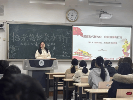 为深入学习贯彻党的二十届四中全会精神,落实公司领导干部联系班级制度,12月26日,公司后勤处副处长钟娟在明德楼B116,深入联系班级—tyc5997太阳集团教育学专业2025级1班班会现场并为同学们讲授专题党课。
